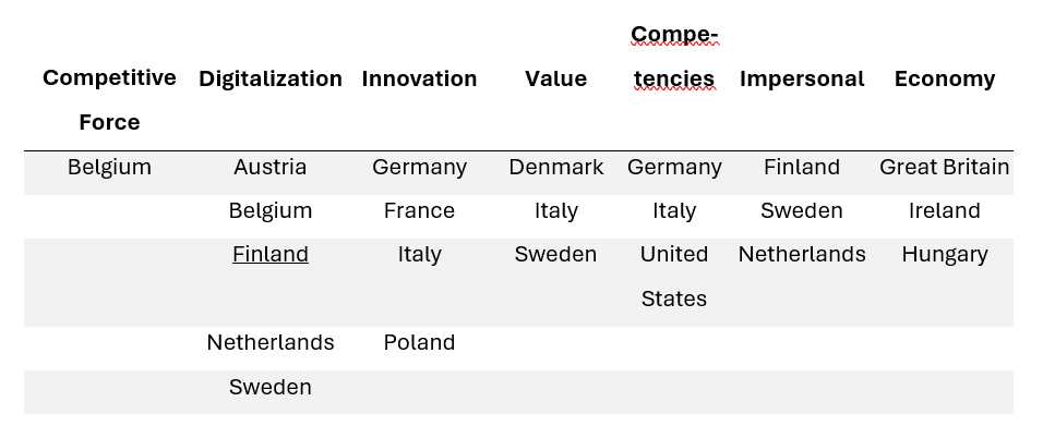 Sales is challenging.  Especially international sales within Europe. Sales is always personal and cultural dependent, as seen from this study. Based on the results, it may be a good idea to address the implication your offer may have on the competitiveness more often in Belgium or and to focus more on digital solution possibilities in Austria. In Finland, Sweden and the Netherlands, when addressing digitalization solution possibilities, implications for a more impersonal sales process may have to be taken into account more likely. Focusing on innovational aspects would be more important in Germany, France, Italy and Poland
