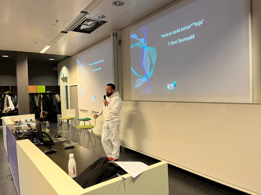 Kuva 1. Sami Saarenpää jakoi puheenvuorossaan omia positiivisia ja negatiivisia kokemuksiaan social sellingistä.