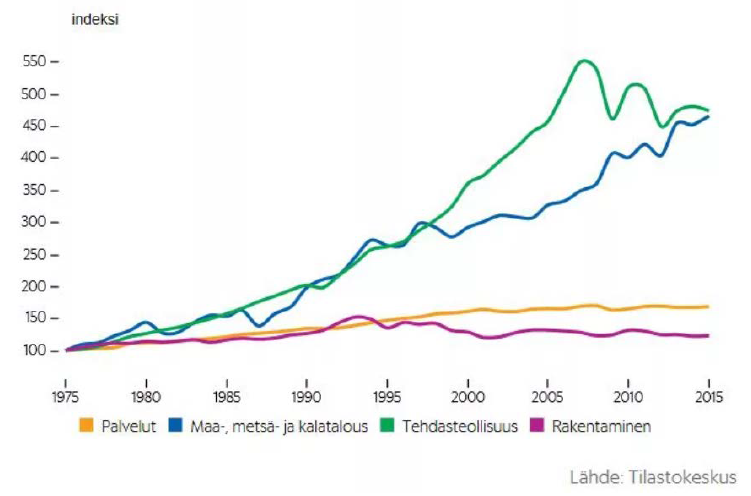Rakennustuotannon on sanottu olevan muuta teollisuutta huomattavan paljon jäljessä, jopa useita vuosikymmeniä. Tilanteen voikin todeta Tilastokeskuksen kuvaajasta (kuva 1), jonka mukaan rakentamisen tuottavuus ei ole kehittänyt juuri lainkaan ja poikkeaa merkittävästi muista toimialoista.