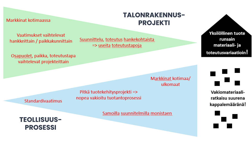 Monessa suhteessa toimialat ovat toistensa vastakohtia (kuva 2). Teollinen prosessi perustuu pitkään tuotekehitykseen: tuloksena syntyy paras materiaalin käytön ja tuotantotavan optimoiva lopputuote, jota monistetaan runsaina kappalemäärinä. Talonrakennushankkeen läpimeno on monin tavoin päinvastainen. Teollisesta prosessista poiketen rakentaminen nähdään projektina, jonka lopputulos on yksi ainutkertainen rakennus yksilöllisin suunnitelmin, mutta runsain materiaali- ja toteutusvariaation.