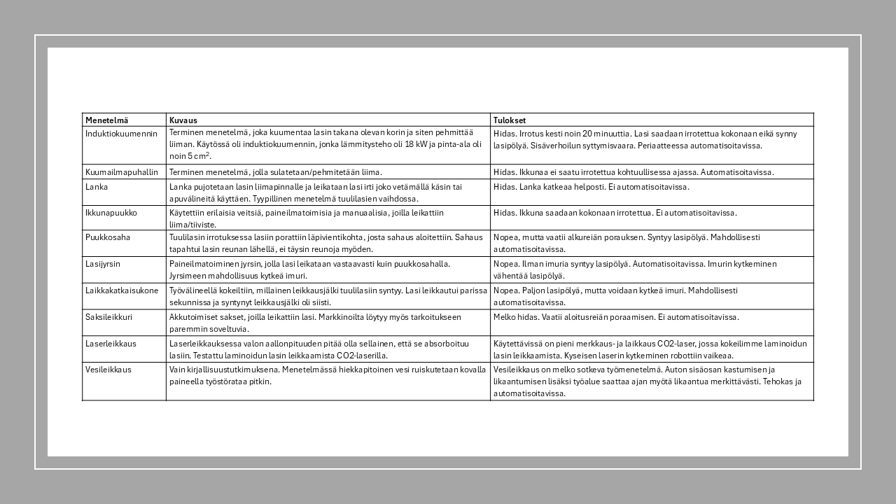 - Tuulilasien laminoitua lasia pystyttiin leikkaamaan ja kuumentamaan, mutta karkaistut sivulasit eivät kestäneet minkäänlaista manipulaatiota hajoamatta.