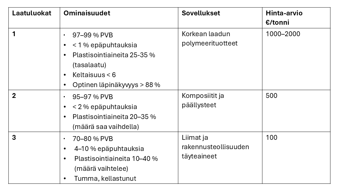 Taulukossa 6 on esitetty kolme kierrätys-PVB:n laatuluokkaa mahdollisine sovelluskohteineen ja hintoineen.