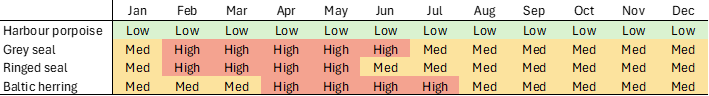 Table 2: Sensitivity levels (Low/Medium/High) by month for harbour porpoise, grey seal, ringed seal, and Baltic herring in the Navakka project area.