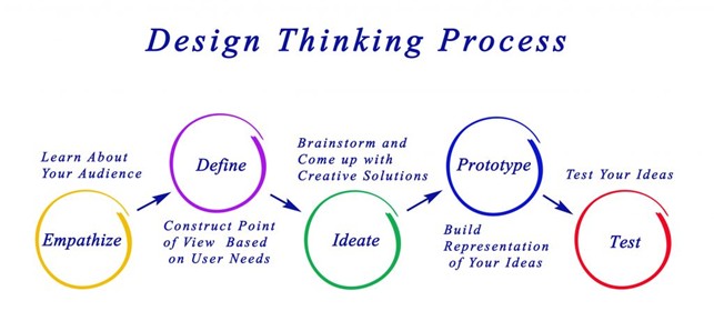 Jotta päästäisiin irti aiemmin mainitusta teknologia- ja ominaisuuslähtöisestä ajattelusta eli oman ”lempilapsen” puolustamisesta ja voitaisiin keskittyä asiakaskokemuksen parantamiseen, on mahdollista hyödyntää Design Thinking -ajatusmallia eli muotoiluajattelua. Sen avulla sukellamme syvemmälle asiakkaan kokemusmaailmaan esimerkiksi empaattisen lähestymistavan, luovan ongelmanratkaisun ja prototypoinnin keinoin. Tätä ajatusmallia ovat kuvanneet mm. Kelley & Kelley (2014) oheisen prosessidiagrammin avulla (kuva 1).