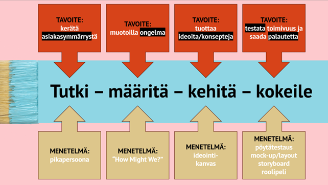 Discover eli tutki-vaiheessa kerätään taustatietoja eri lähteistä ja keskustellaan käyttäjien sekä muiden palveluun liittyvien ryhmien edustajien kanssa asiakasymmärryksen kartuttamiseksi. Tiedot palvelun asiakkaista, heidän käyttäytymisestään ja mieltymyksistään on tärkeä selvittää. Määritä-vaiheen (Define) aikana pyritään kuvaamaan haaste mahdollisemman tarkasti ja kehitä-vaiheessa (Develop) ideoidaan ratkaisuvaihtoehtoja ja konsepteja. Viimeinen vaihe käsittää ratkaisuehdotusten testaamisen esimerkiksi prototyypin avulla. Jokaisessa prosessin vaiheessa kannattaa valita tapauskohtaisesti oikeat menetelmät ja työkalut. Työpajassa sovellettiin neljää menetelmää, jotka on esitetty kuvassa 4.